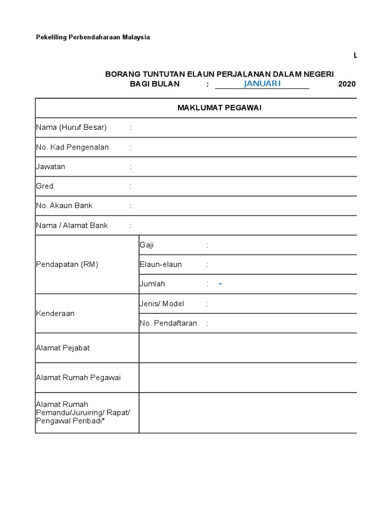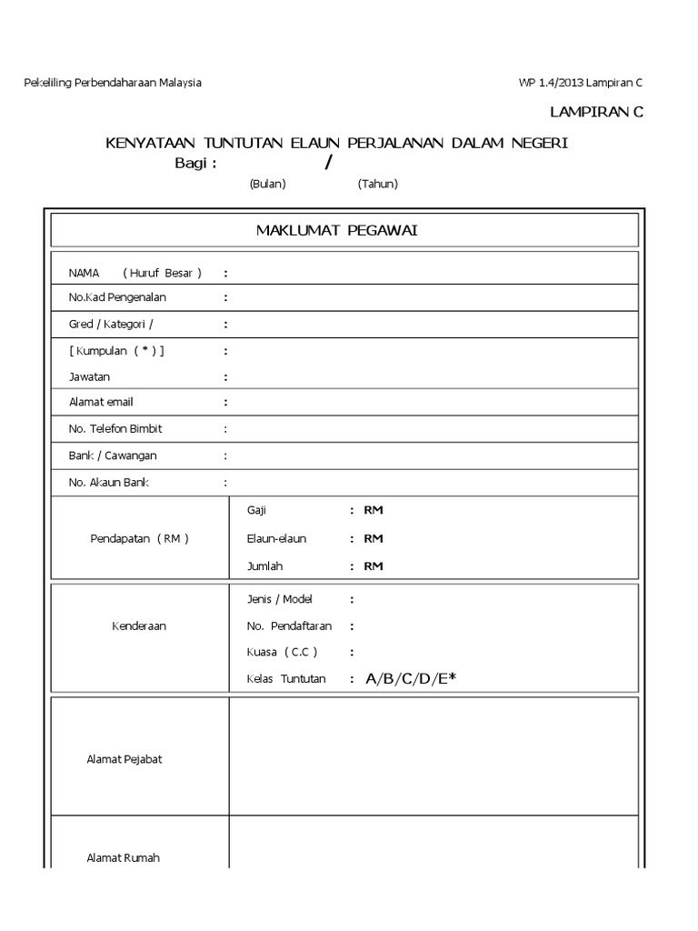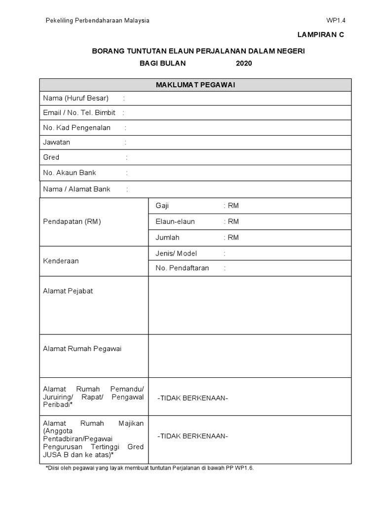 Maklumat Pegawai Fp Utm My Perjalanan Dalam Borang Tuntutan Elaun Perjalanan Dalam Negeri Bulan from demo.pdfslide.tips 1 borang tuntutan perjalanan mengikut format yang ditetapkan. 3.3.3 bagi pegawai lantikan baru yang belum mepunyai nombor ahli kwsp/socso hendaklah mengisi borang pendaftaran ahli (kwsp 3 (ahl) dan borang pendaftaran pekerja. Nota penerangan borang tp sistem taksir sendiri. Borang yang tidak lengkap akan dikembalikan. Posted by unknown 5:49 am. Tuntutan adalah terhad kepada jarak perjalanan melebihi 25 km daripada rumah kediaman ke hospital kerajaan berpakar yang dirujuk oleh hospital/ klinik kerajaan berhampiran rumah kediaman. 31 disember 2018 muka surat : 1.1 borang tuntutan perjalanan yang lengkap diisi (termasuk pendahuluan diri) dan ditandatangan tajuk :